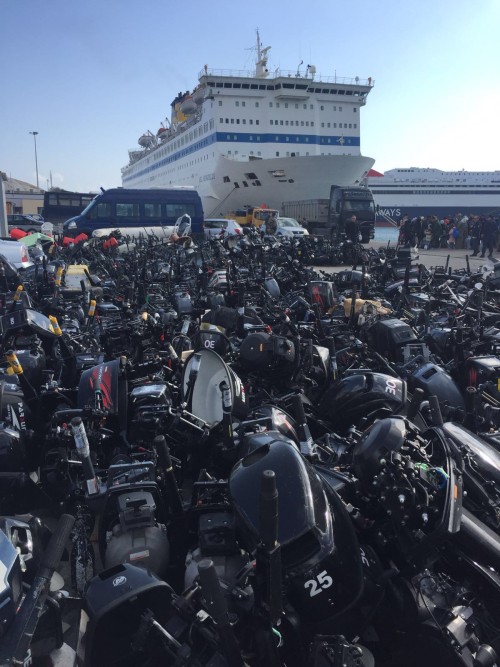 "Alle buitenboordmotoren die inbeslagname zijn genomen. Op de achtergrond de veerpont waarmee de vluchtelingen van Lesbos naar Athene worden gevaren. De economische vluchtelingen worden eruit gehaald en in gevangenis gezet om te worden teruggestuurd naar de Noord Afrikaanse landen zoals Marokko en Algerije. Dit vormt 5% van de vluchtelingenstroom. 85% zijn Syriers, Afghanen en Irakezen."