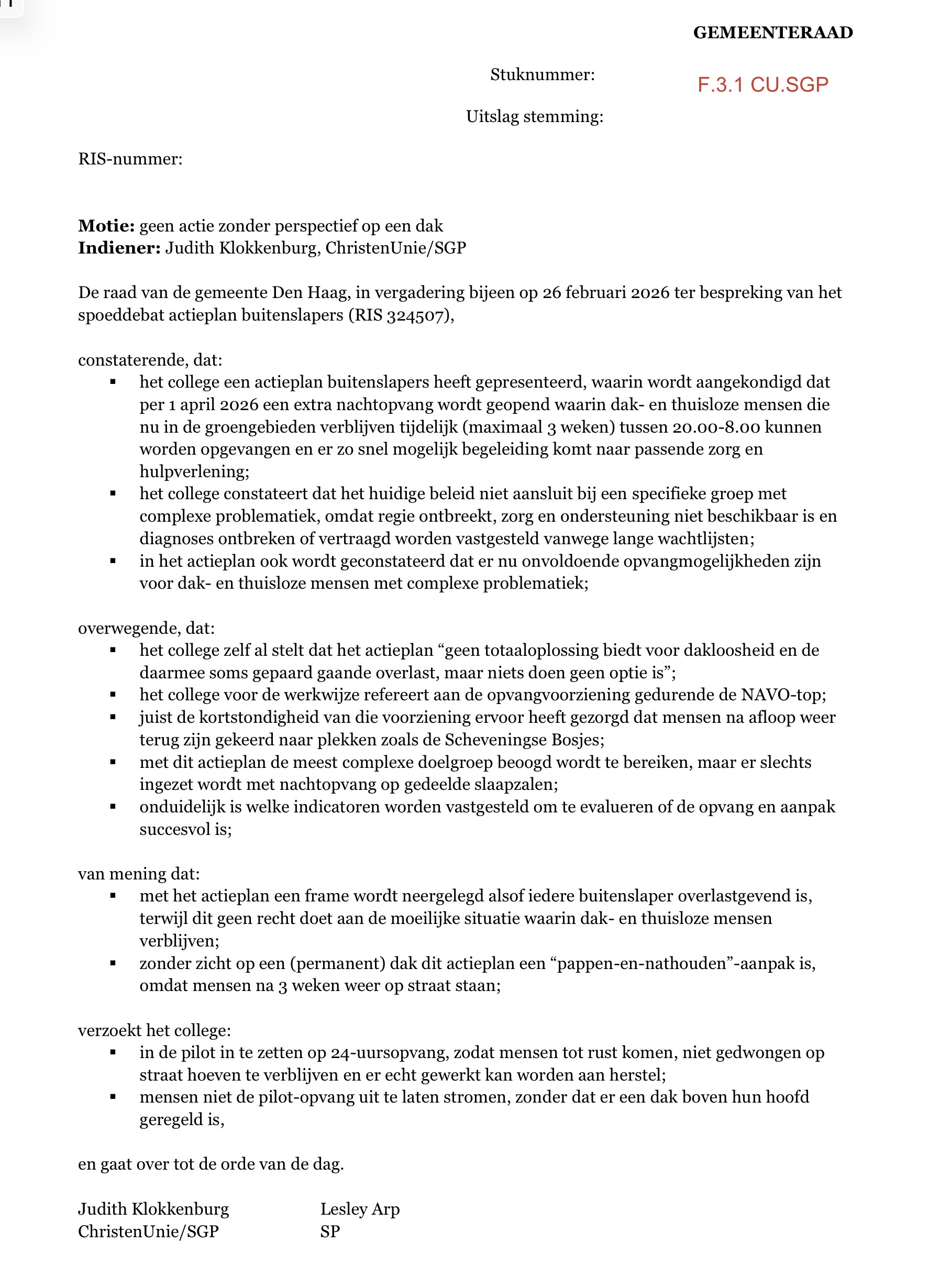 De motie die ik indiende met de SP haalde helaas geen meerderheid. We gaan zien hoe de pilot gaat lopen. Hoelang het gaat duren voordat mensen weer op straat moeten verblijven en in groengebieden moeten slapen. Hoeveel mensen daadwerkelijk langdurig perspectief krijgen. Ik wens de uitvoerders veel Zegen en succes.
